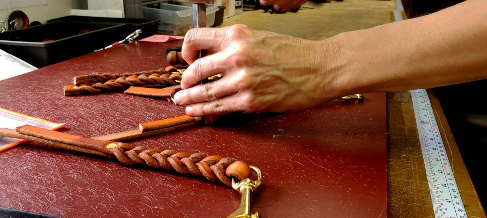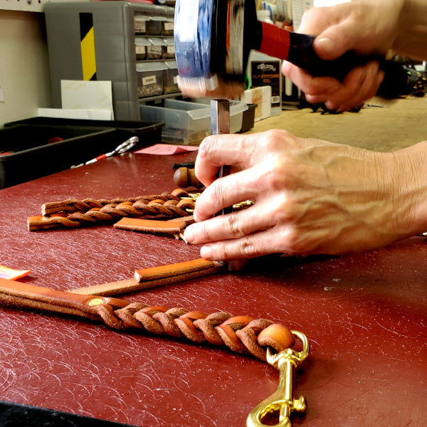 Every leash, collar, and harness is handmade by skilled leather artisans using premium American leather and solid brass and stainless steel hardware.. Designed for durability, comfort, and timeless style — gear you and your dog can trust for years to come.