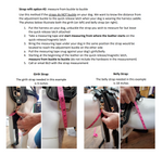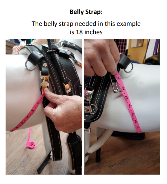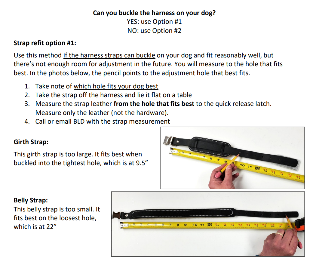 Straps have several inches of adjustment range. All harness strap measurements are taken from the center adjustment hole. There is 1.5-2” of adjustment smaller and larger from the given measurement. For example: a 30” girth strap adjusts from 28 to 32”. This means you can buy a strap that’s within 1 ½” of the dog’s actual measurements for a good fit (assuming the measurement is accurate).