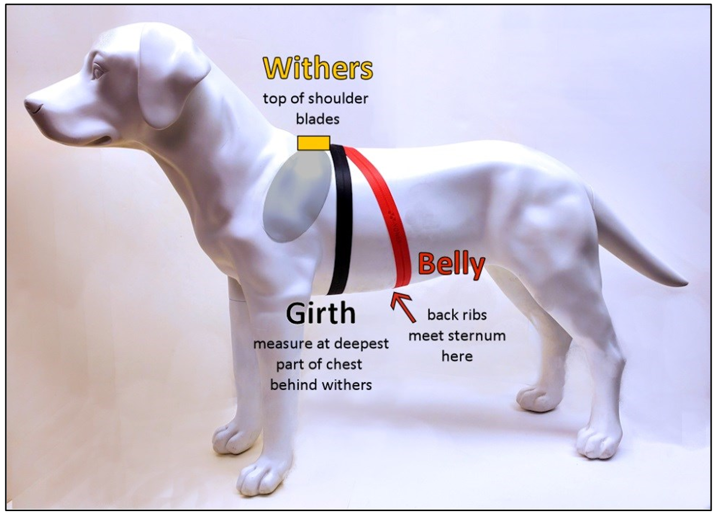 - Bring the measuring tape under this point of the dog’s ribs, and pull the tape up and forward to the “sweet spot” behind the withers