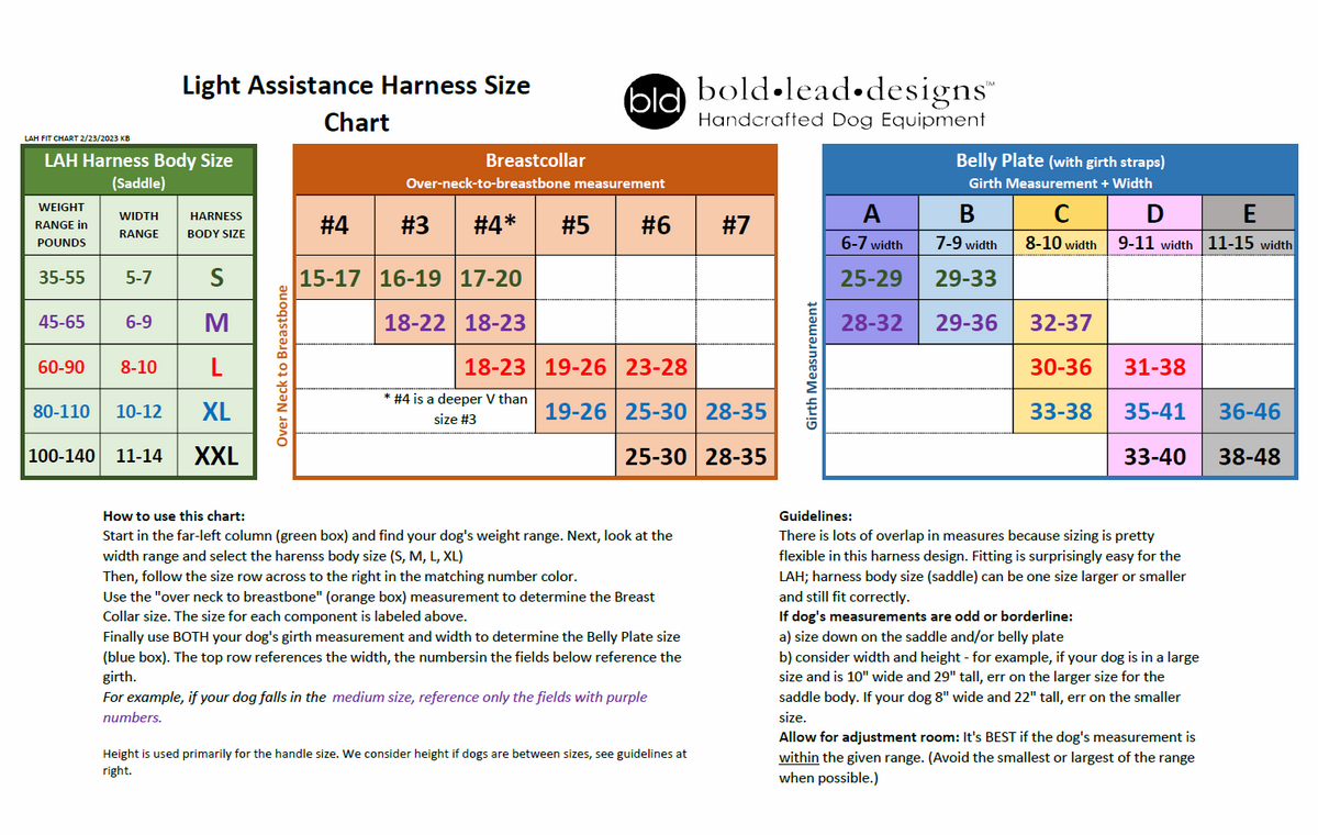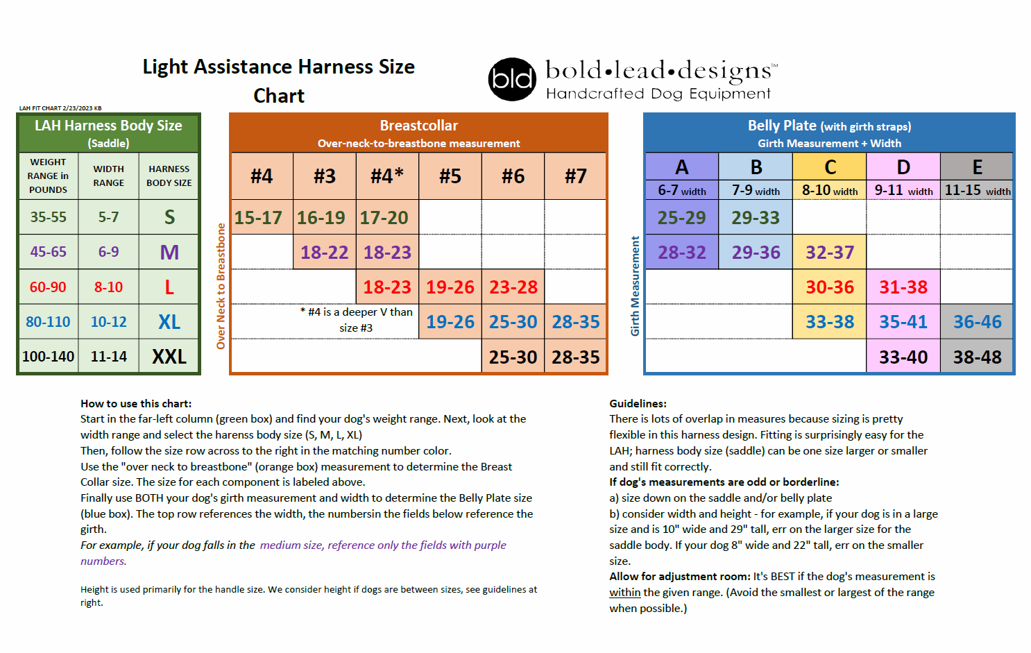 We've put together harnesses based on real life dog sizes! Use the LAH Size Chart to see the adjustment range for each of the available harnesses.