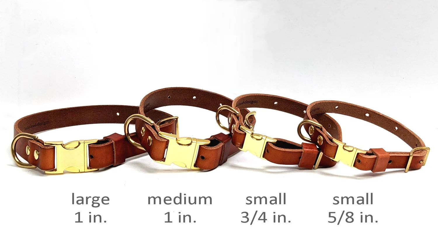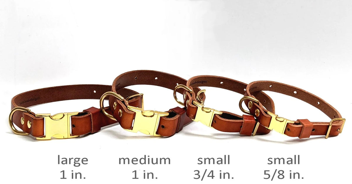 These beautiful leather collars are made from the same premium full grain equestrian leathers and hardware as our awesome leads (none of the cheap stuff found on most pet collars). Edges of the leather are beveled for a smooth edge for comfort and to protect your dog’s coat. There are no rivets or stitching to wear out or come undone.