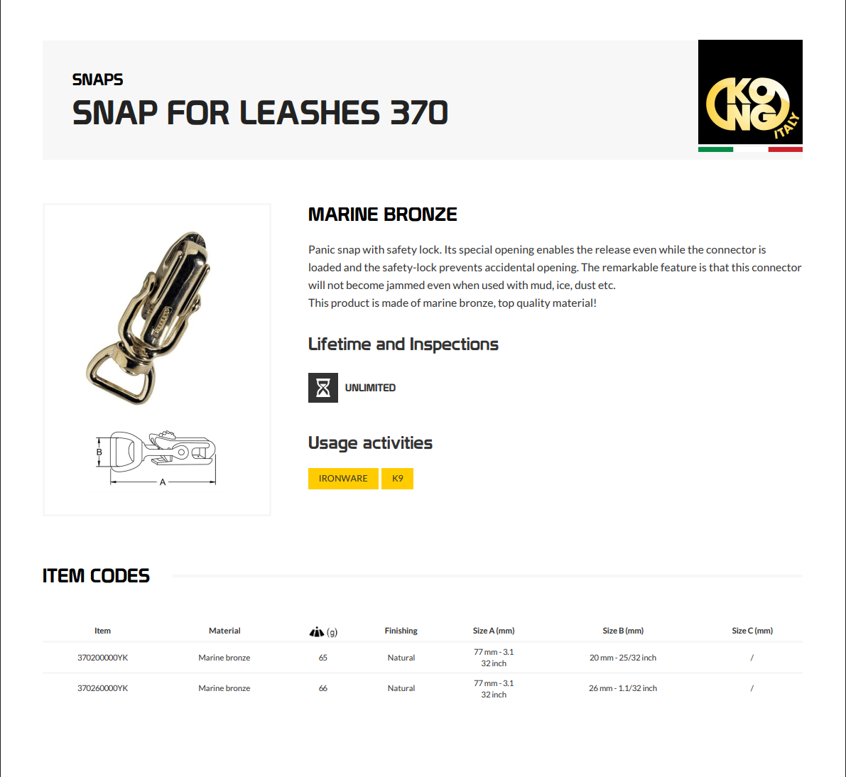 Panic snap with safety lock. Its special opening enables the release even while the connector is loaded and the safety-lock prevents accidental opening. The remarkable feature is that this connector will not become jammed even when used with mud, ice, dust etc. Manufactured by KONG Italy from solid marine bronze.