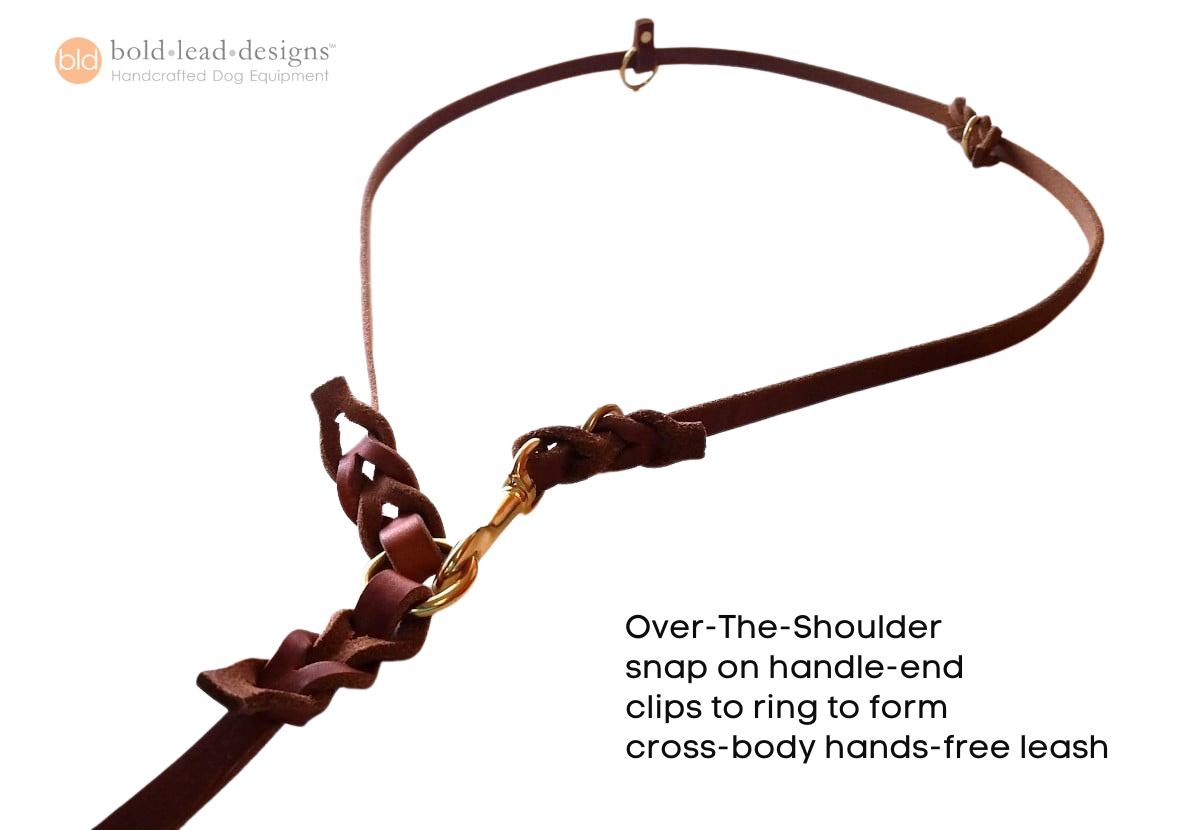 - Configure from the other end to create a larger cross-body-loop, with 54 inches of leash from your hip to the dog; it shortens to 28 inches