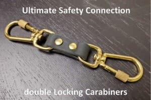 - Ultimate Safety Connection is made with our special Locking Carabiner Snap(s) that is secured with a screw-down lock sheath. This version is heavy duty and recommended only for large breed dogs. Made with a 3/4″ wide leather connector is approximately 7.5″ long (20 cm), and is only available with brass/gold colored hardware. Available in two sizes: