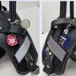 The harness can accommodate a few personal items, such as an ID badge, tags, or a clip-on light. The ID badge is clipped to the handle O-ring and tucks behind the handle and reflective strap.