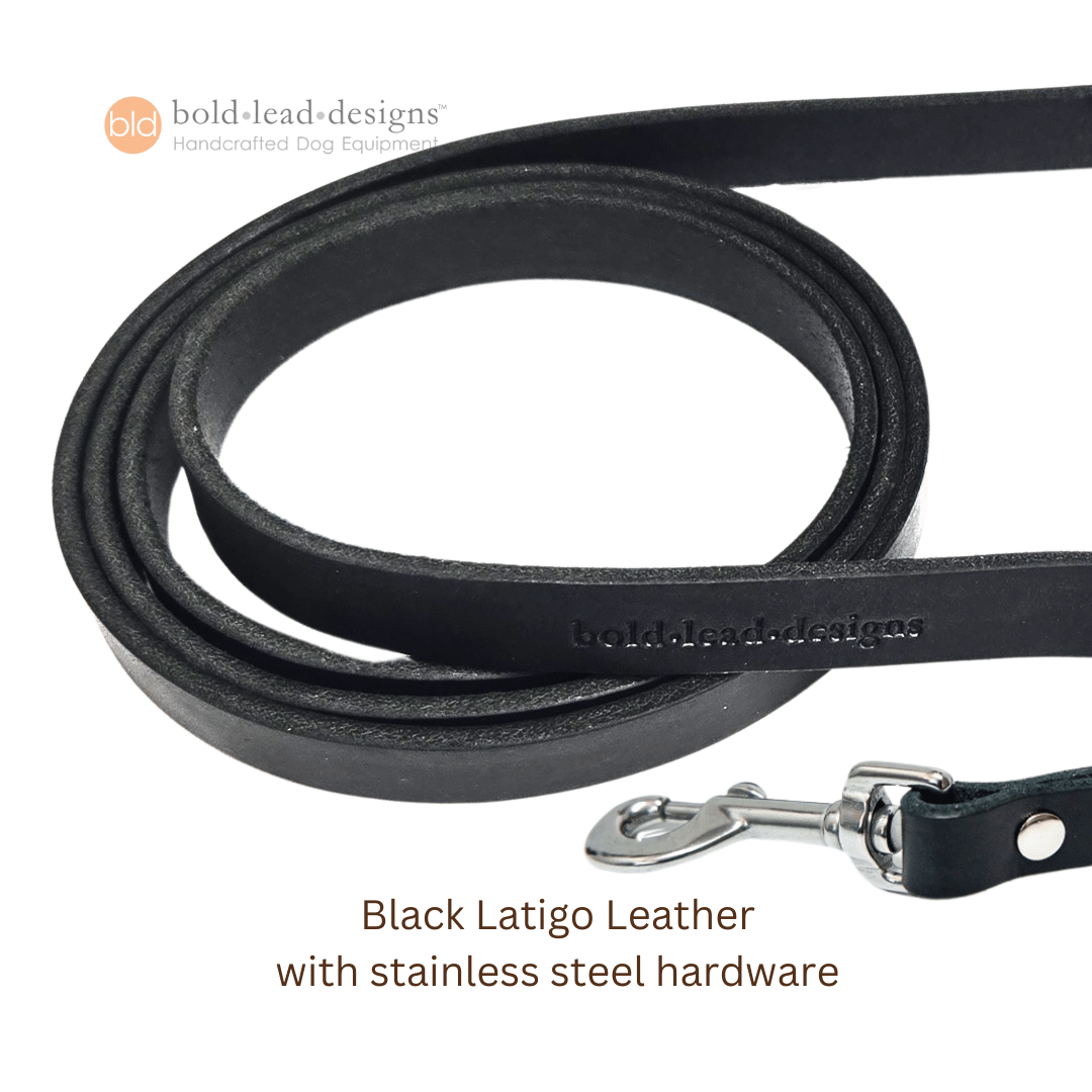 Latigo tanned specifically for quality horse tack and premium pet products and has a high tensile strength. Your leash will start out a bit firm yet flexible and will very quickly soften and will continue to get better with age. The rich black color is drum dyed during tanning (rather than just dyed on the surface). Made in North America from select US steer hides. Stainless steel (silver color) hardware is standard.