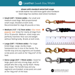 Small 3/8 inch (7 mm)—Best for small and medium-sized dogs 15-30 pounds. Narrow, lighter weight leather with small yet strong hardware is ideal for small to medium dogs when a thin leash is desired. Constructed with sturdy, elegant braids at both ends. (Not recommended for larger dogs)