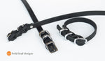 Latigo tanned specifically for quality horse tack and premium pet products and has a high tensile strength. Your leash will start out a bit firm yet flexible and will very quickly soften and will continue to get better with age. The rich black color is drum dyed during tanning (rather than just dyed on the surface). Made in North America from select US steer hides. Stainless steel (silver color) hardware is standard.