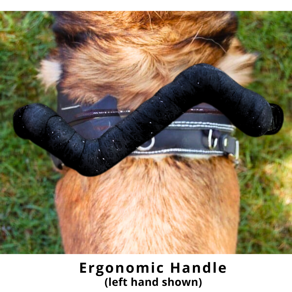 Support Pull Handle - highly recommended! Designed for heavier momentum and pulling needs. Provides optimal pulling pressure distribution. Handle attaches to d-rings with spring snap clips. “Mouse ear” loops keep the handle in position at a slight angle back. This handle drops a bit when you let go of it, has a looser feel than A or B, but is best for those who need moderate gait stabilization, a sturdy momentum pull, and guiding/leading. - Most popular as a second handle in the semi-rigid style!