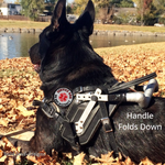 - Rigid metal support handles can be folded down to allow dogs into tight spaces, into vehicles, and under tables/chairs
